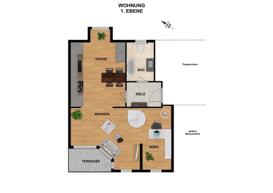 Dachterrasse: Über das Wohnzimmer zugänglich und bietet einen ansprechenden Ausblick – ideal, um an schönen Tagen zu entspannen.